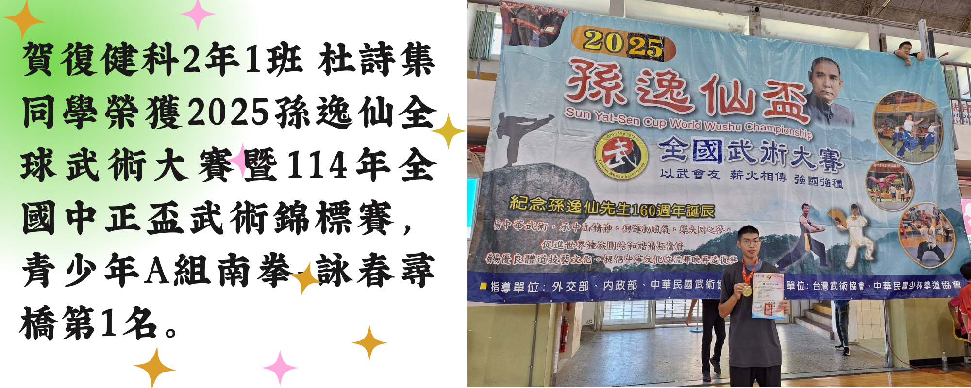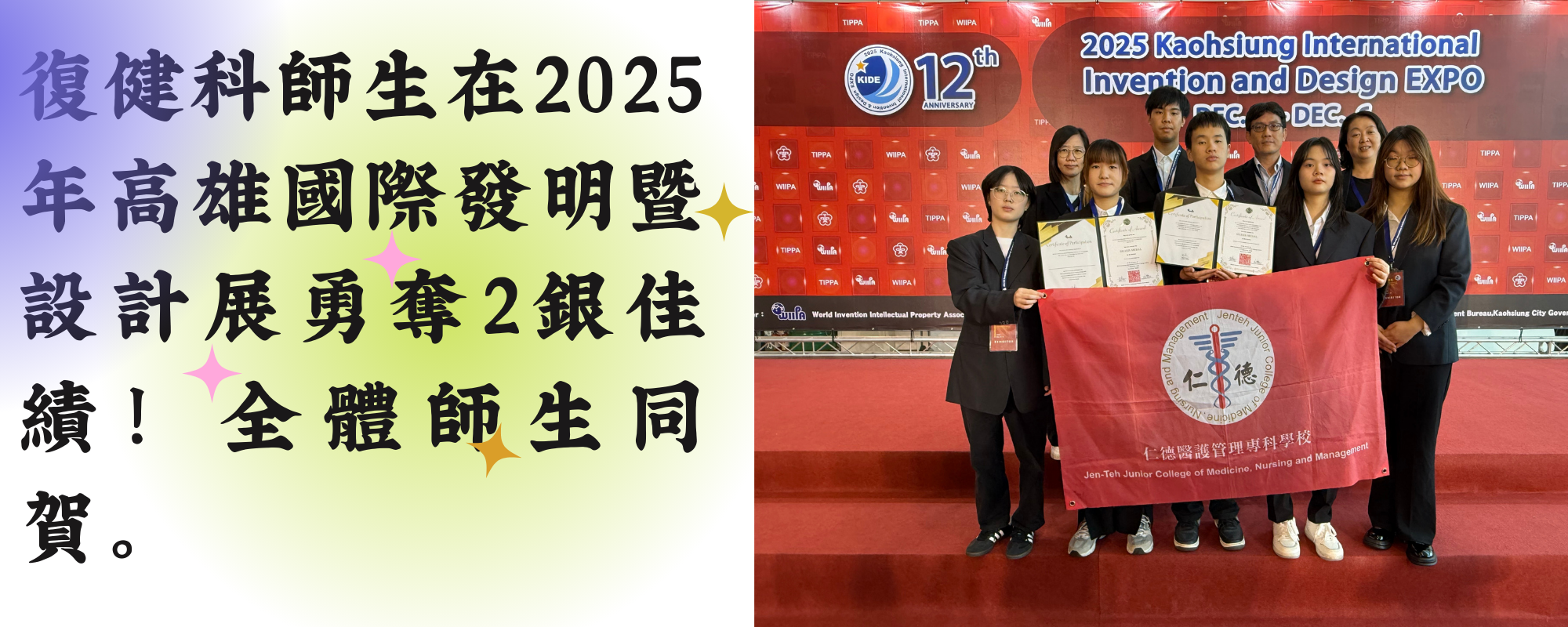 榮譽成就 復健科學生吳星霆參加「114年全國語文競賽-苗栗縣初賽、複賽」,榮獲寫字高中組特優。賀復健科2年1班 杜詩集 同學榮獲2025孫逸仙全球武術大賽暨114年全國中正盃武術錦標賽,青少年A組南拳-詠春尋橋第1名。賀! 郭祖祥老師帶領復健科學生蘇安予、楊欣、林可忻參加「2025 ITEX馬來西亞國際發明展」,獲得銅牌殊榮,全科師生同賀賀! 郭祖祥老師帶領復健科學生蘇安予、楊欣、林可忻參加「2025 INTARG波蘭國際發明展」,獲得金牌與特別獎殊榮,全科師生同賀2024年高雄國際發明展復健科老師帶領5R301徐翊笍同學參加2025韓國世界發明創新競賽獲金獎。同體師生同賀賀復健科2年1班 杜詩集 同學榮獲2025年台灣區詩界盃武術錦標賽,高中組男子組第一量級散打搏擊第3名、青少年A組南拳-詠春尋橋第3名。賀復健科2年1班 鄧文賢 同學榮獲2025年台灣區詩界盃武術錦標賽,高中組男子組第一量級散打搏擊第2名。賀!復健科四年級蔡同學參加114年全國大專校院運動會賀!本校復健科4年級蔡佳穎同學榮獲2025年台灣國際常青田徑錦標賽賀!本校復健科4年級蔡佳穎同學榮獲2025年台灣國際常青田徑錦標賽24歲女子組撐竿跳比賽第1名及三級跳遠比賽第1名賀! 復健科謝嘉莉、謝如柔同學參加2024苗青創想家黑客松競賽於決賽獲得第二名佳績。113年第二次專技高考取得佳績賀!復健科四年級蔡同學參加114年全國大專校院運動會112年度復健科國考榜單復健科老師帶領學生參加2021年克羅埃西雅國際發明展獲一金二銀一銅佳績。全體師生同賀。復健科參加2022年克羅埃西亞INOVA國際發明展獲得佳績本科何敘緯同學團隊獲2021年克羅埃西亞INOVA國際發明展金牌,獲教育部接見表揚。復健科老師帶領學生參加2021年高雄國際發明展獲二金二銀一銅佳績。全體師生同賀。張欽智老師指導復健科學生廖芷妤、廖軒誼、蔡佳君,參加國際發明創新競賽獲得一銀、一銅及一特別獎,全體師生同賀!!賀本校郭祖祥、張欽智老師指導復健科學生參加長庚科技大學「2021年第七屆全國技專校院老人福祉產品服務創新設計競賽」獲海報組第二名殊榮,全體師生備感榮耀。2025印尼發明家日-世界發明科學展賀!本校復健科4年級周柏豪同學榮獲2025年台灣國際常青田徑錦標賽 24歲男子組擲鏈球第1名及擲鐵餅比賽第1名及擲標槍第3名賀!本校復健科4年級張祐祥同學榮獲2025年台灣國際常青田徑錦標賽 24歲男子組擲標槍第1名及擲鏈球比賽第2名及擲鐵餅第2名賀!復健科4年級蔡佳穎同學榮獲114年全國大專田徑公開賽 榮獲一般女子組撐竿跳比賽第一名賀!本校男子排球隊參加114年苗栗縣長盃排球賽榮獲第三名賀!本校復健科4年級蔡佳穎同學榮獲2025年台灣國際常青田徑錦標賽賀!復健科4年級周柏豪同學榮獲114年全國大專田徑公開賽 賀!復健科4年級周柏豪同學榮獲114年全國大專田徑公開賽榮獲一般男子組擲鏈球比賽第二名賀復健科1年4班何雨宸同學榮獲114年第12屆教育盃全國獨輪車錦標賽,高中組女子個人之IUF迴旋障礙賽第4名、單腳前進競速50公尺第7名、前進競速400公尺20吋地3名 想多了解本科 可加Line 115復健科社群最新消息114年復健科加袍典禮精彩落幕 2026 年 1 月 5 日12/10復健科加袍典禮復健科四年級物理和職能治療準實習生,感謝董事長與校長到場勉勵以及師長的諄諄教誨最新消息仁德醫專復健科 2025高雄KIDE國際發明暨設計展獲得雙銀獎!邀請國中生加入創新復健的行列 2025 年 12 月 10 日高雄,2025年12月4日 — 仁德醫專復健科在2025高雄KIDE國際發明暨設計展上表現卓越,榮獲兩枚銀牌! […]最新消息復健科修課相關規定公告 2025 年 1 月 16 日復健科修課相關規定公告 學生跨科修課認列專業選修學分數上限:8學分。 全校修課規定學生只可以下修,不得上修(例 […]最新消息動物輔助治療 2024 年 12 月 3 日特別的醫生—動物輔療介紹。復健科職能治療組特別邀請台中榮民總醫院黃立婷社工師介紹動物輔助治療。準治療犬在演講現 […]最新消息113年復健科分組座談 2024 年 11 月 29 日進入復健科的第一件大事的前哨站-分組座談會先準備好、仔細思考,分組當天順利選上心怡的未來職業最新消息113年復健科加袍典禮完美落幕 2024 年 11 月 29 日11/20復健科加袍典禮復健科四年級物理和職能治療準實習生,感謝校長到場勉勵及師長的諄諄教誨更多最新消息…復健科介紹學長的經驗分享復健專業課程體驗活動專業肌貼示範 累計瀏覽次數 : 12921
